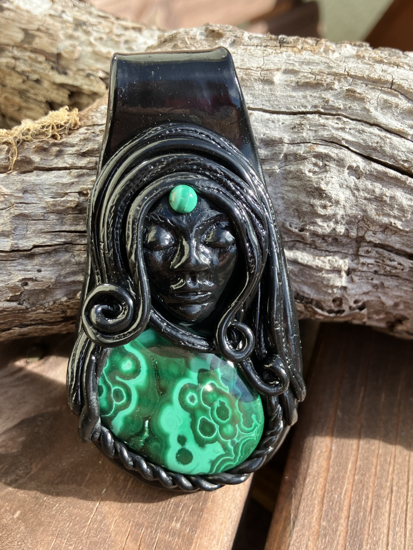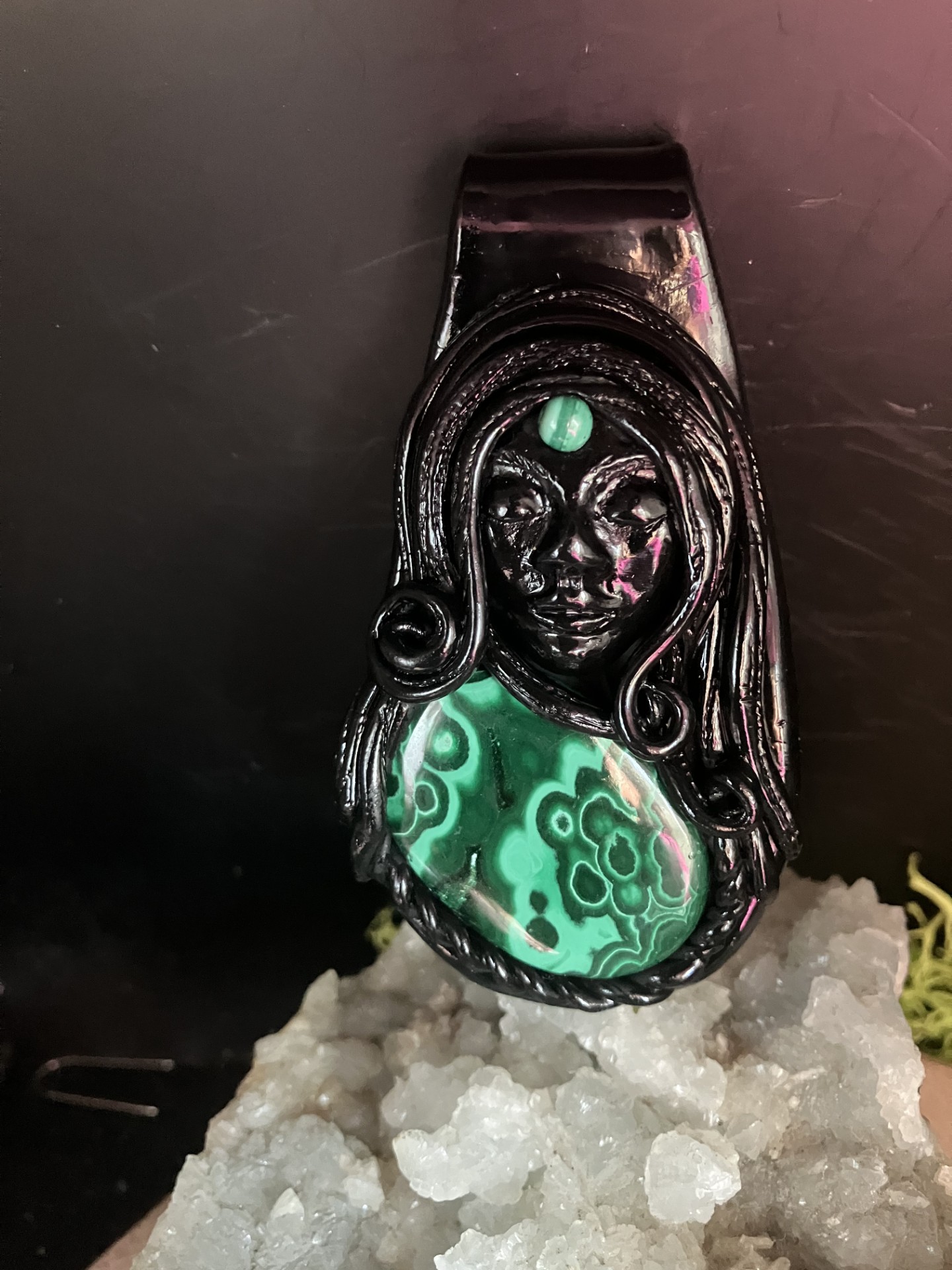 Beautiful Malachite Goddess, she measures 3.3 inches (love that number combination). She has Malachite in her belly and also on her forehead.